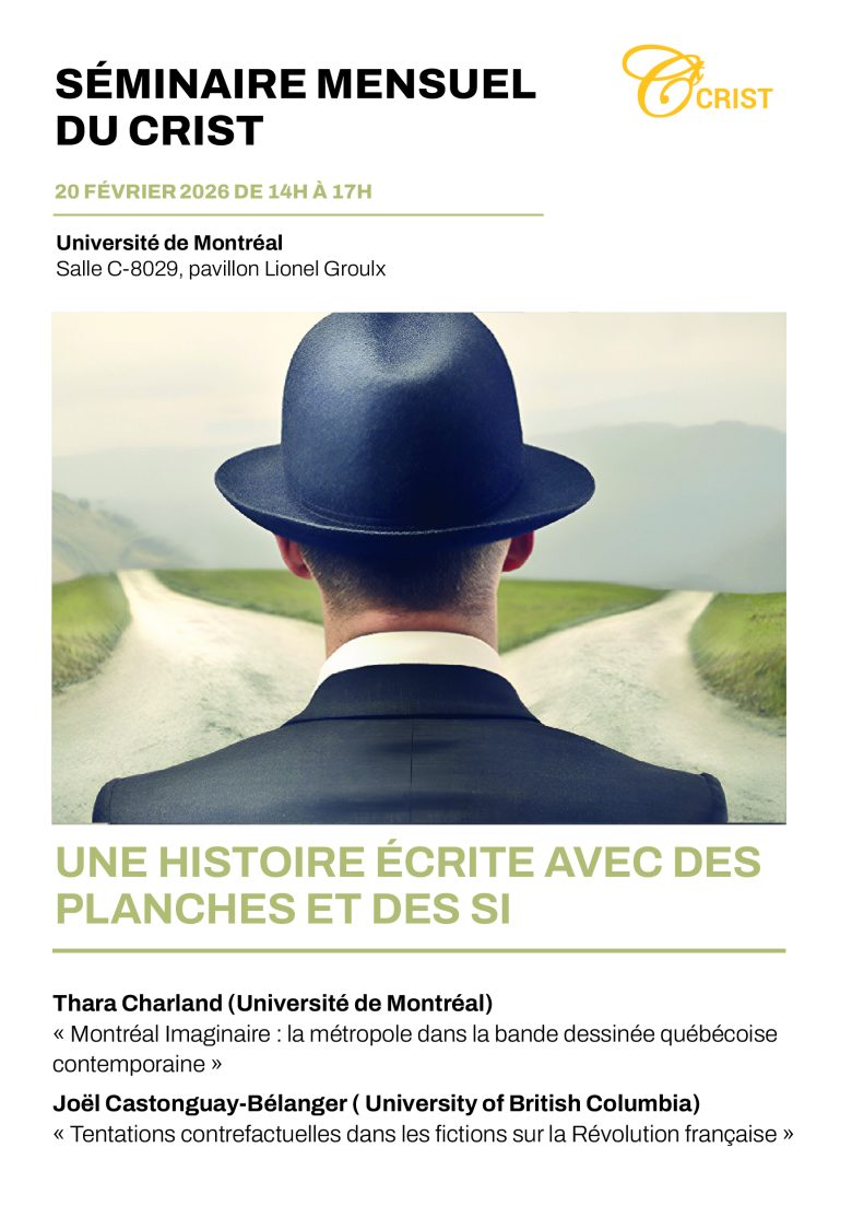 UNE HISTOIRE ÉCRITE AVEC DES PLANCHES ET DES SI Vendredi 20 février 2026, de 14h à 17h Université de Montréal – Salle C-8029, pavillon Lionel-Groulx Avec les communications de : Thara Charland (Université de Montréal) « Montréal Imaginaire : la métropole dans la bande dessinée québécoise contemporaine » Joël Castonguay-Bélanger (University of British Columbia) « …
