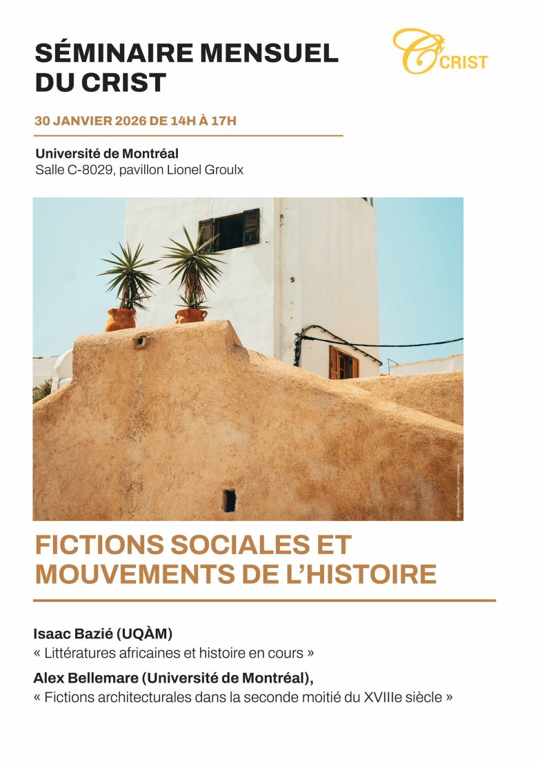 FICTIONS SOCIALES ET MOUVEMENTS DE L’HISTOIRE Vendredi 30 janvier 2026, de 14h à 17h Université de Montréal – Salle C-8029, pavillon Lionel-Groulx Avec les communications de : Isaac Bazié (UQÀM) « Littératures africaines et histoire en cours » Alex Bellemare (Université de Montréal) « Fictions architecturales dans la seconde moitié du XVIIIe siècle »
