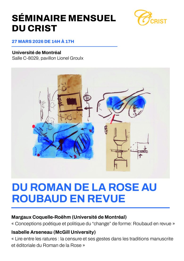 DU ROMAN DE LA ROSE AU ROUBAUD EN REVUE Vendredi 27 mars 2026, de 14h à 17h Université de Montréal – Salle C-8029, pavillon Lionel-Groulx Avec les communications de : Margaux Coquelle-Roëhm (Université de Montréal) « Conceptions poétique et politique du « change » de forme : Roubaud en revue » Isabelle Arseneau (McGill University) « Lire …